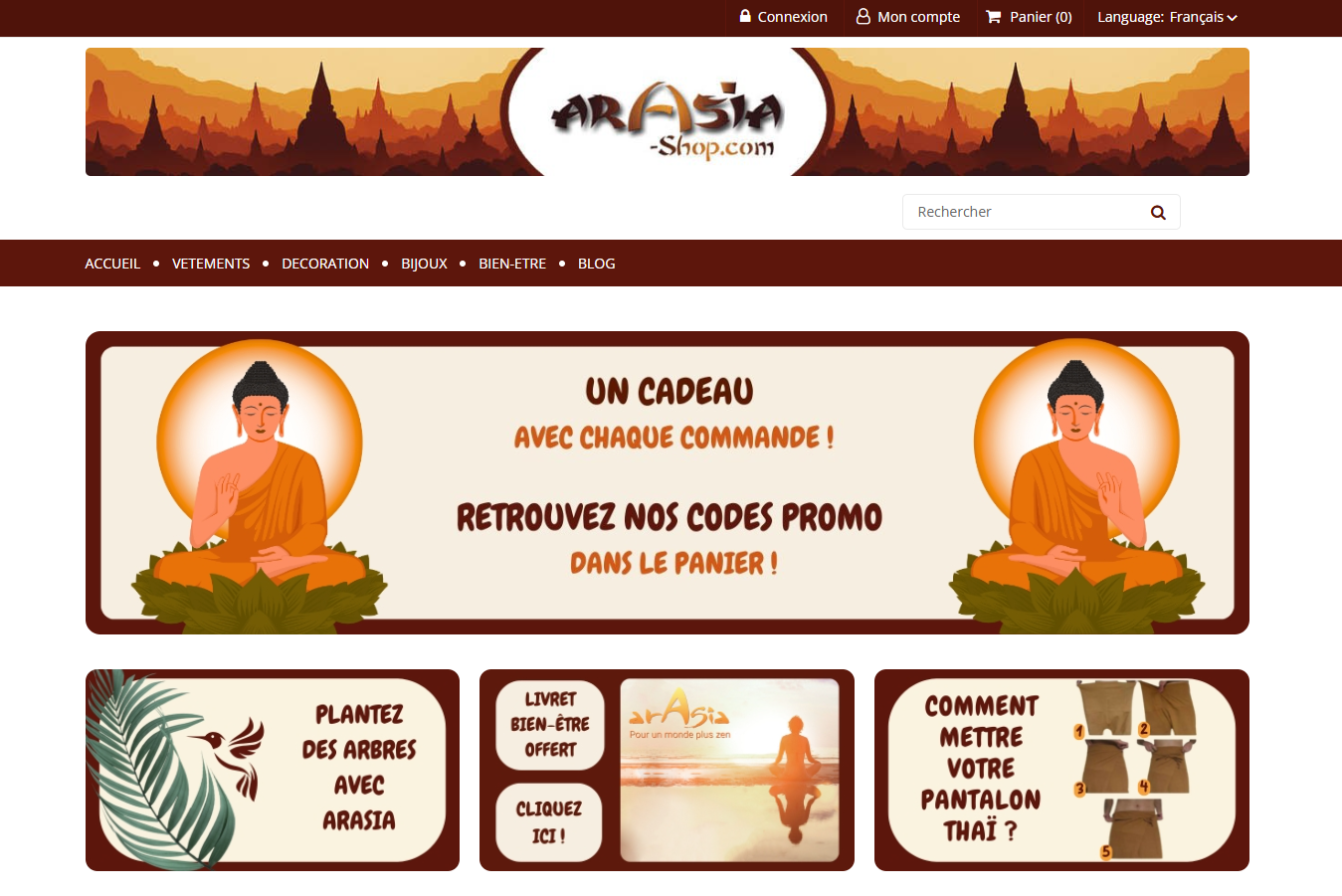Arasia-Shop est une boutique e-commerce française, multilingue (FR/EN/ES), vendant des produits artisanaux d’Asie : vêtements ethniques, accessoires de yoga, malas, bijoux, encens, coussins, objets de méditation, etc.